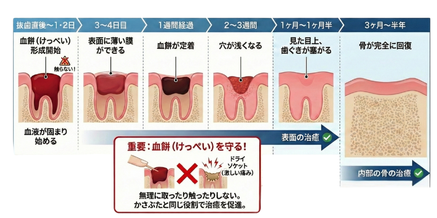 抜歯後の治癒は、まず表面の歯ぐきが閉じ、その後に内部の骨がゆっくりと再生していきます。